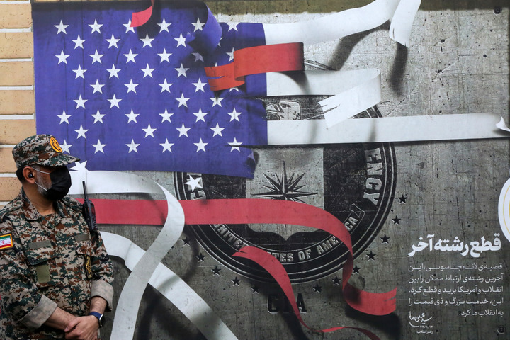 2025年11月4日,在伊朗首都德黑蘭舉行的集會上,安全人員站在反美宣傳畫前。當(dāng)天,伊朗多地民眾舉行集會,譴責(zé)美國霸權(quán)和以色列的侵略行為。新華社發(fā)