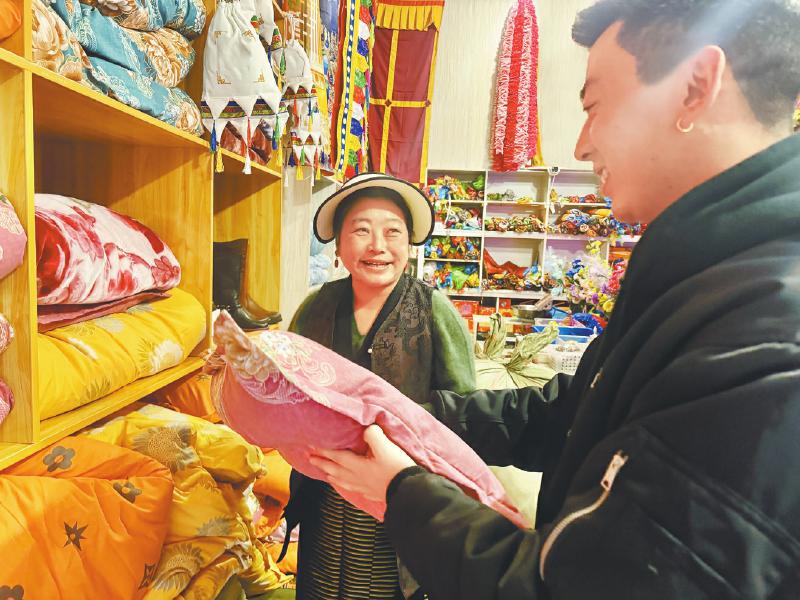 澤仁拉呷正在給顧客介紹商品。張黎萍 攝