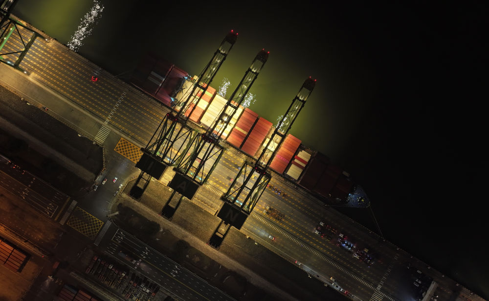 2024年1月16日,大型集裝箱班輪“巴赫”號(hào)靠泊在天津港太平洋國(guó)際集裝箱碼頭(無人機(jī)照片)。新華社記者 趙子碩 攝