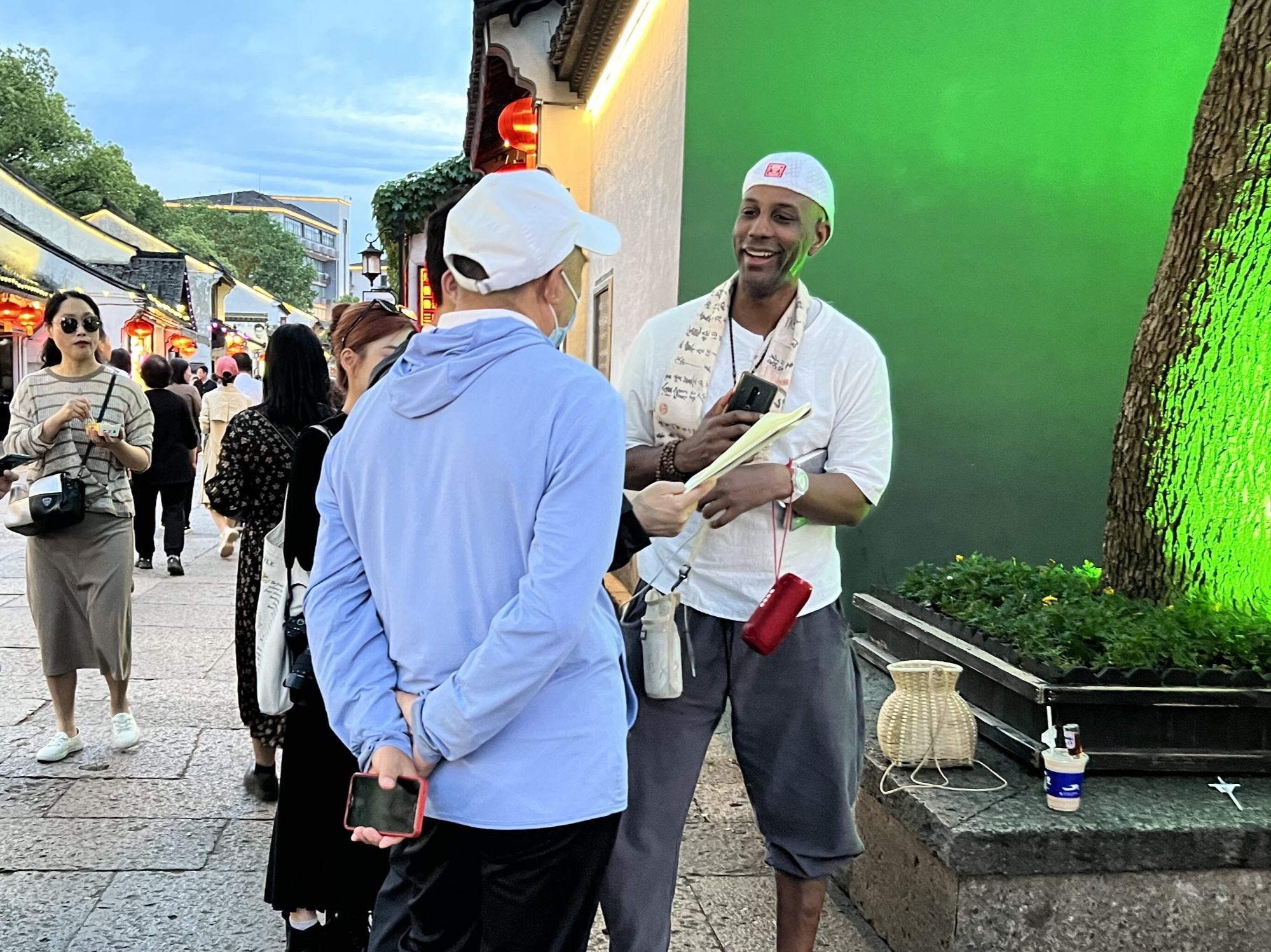 莊子義與游客交流古詩文心得(央廣網見習記者 孫俊 攝)