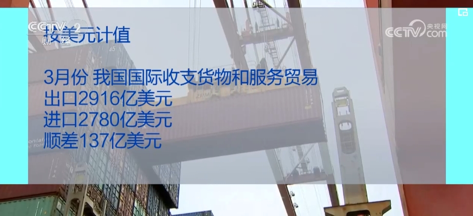 國家外匯管理局發(fā)布數(shù)據(jù),3月份,我國國際收支貨物和服務貿(mào)易進出口規(guī)模為40430億元,同比增長3%。其中,貨物貿(mào)易出口18556億元、進口16053億元;服務貿(mào)易出口2144億元、進口3677億元。按美元計值,3月份,我國國際收支貨物和服務貿(mào)易出口2916億美元、進口2780億美元、順差137億美元。
