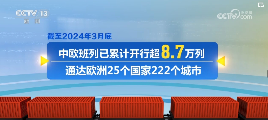 2024年一季度,中歐班列累計開行4541列、發(fā)送貨物49.3萬標箱,同比分別增長9%、10%。截至2024年3月底,中歐班列已累計開行超8.7萬列,通達歐洲25個國家222個城市。