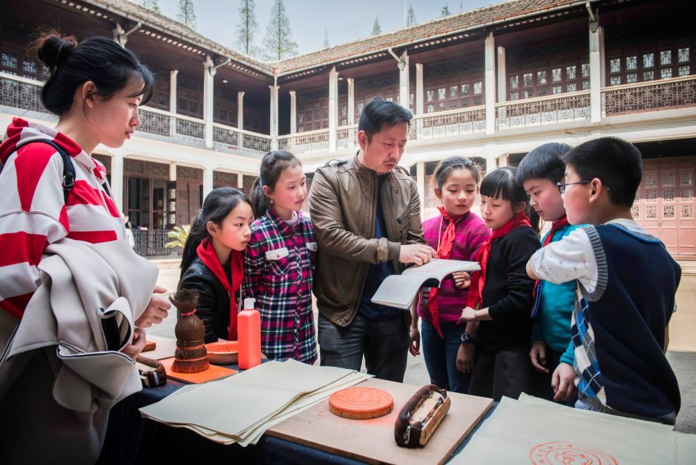 藏用之間,文字被喚醒。南潯實(shí)驗(yàn)小學(xué)自2015年起與嘉業(yè)藏書(shū)樓合作建立雕版印刷傳習(xí)基地,讓雕版文化走進(jìn)了校園,目前該校已培養(yǎng)了200多名雕版印刷的小傳人?!拔覀兿Mㄟ^(guò)學(xué)生走進(jìn)來(lái)參觀,我們走出去講解,把藏書(shū)文化傳播得更廣?!编嵶谀姓f(shuō)。