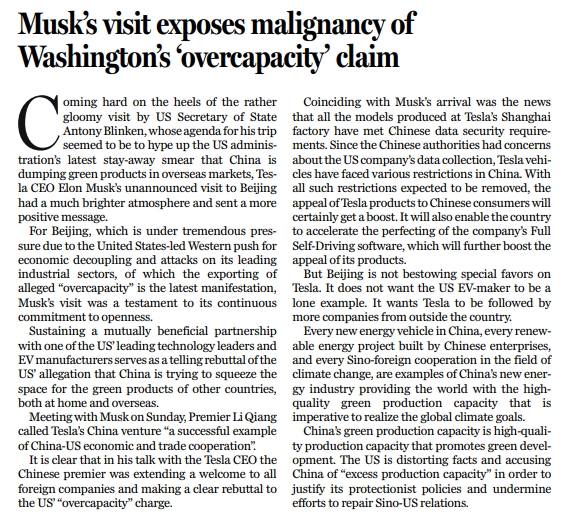 原標(biāo)題:Musk's visit exposes malignancy of Washington's 'overcapacity' claim