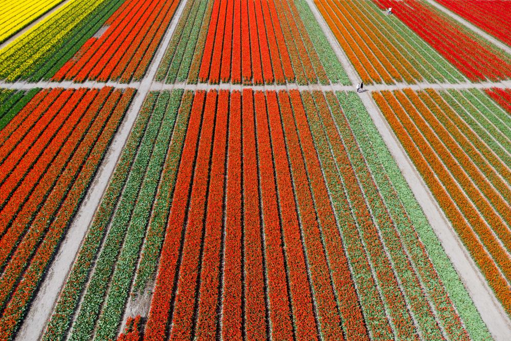 這是4月14日在荷蘭利瑟拍攝的郁金香花田(無人機(jī)照片)。新華社記者孟鼎博攝