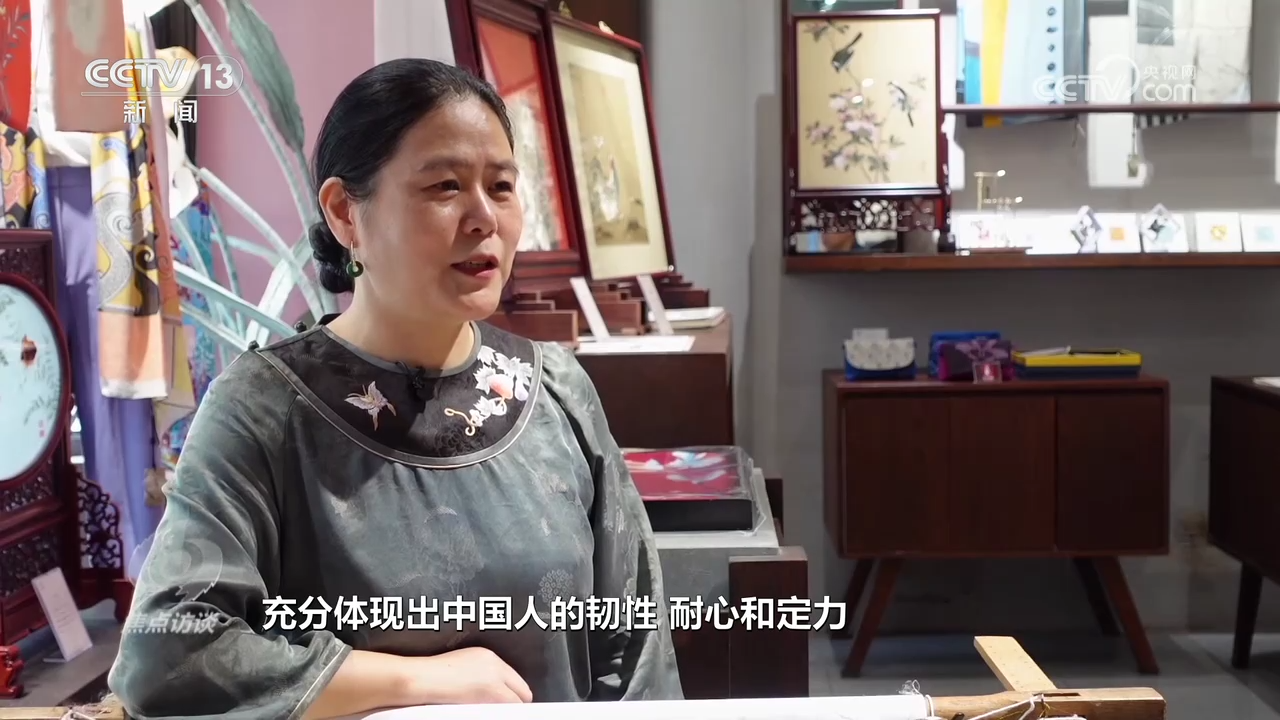 盧建英:“當時我在繡一幅《桃花太平鳥圖》,習近平總書記走到了我的繃架前。他說你好,很親切,很和藹,看得非常仔細。他說中華文化的傳承力有多強,通過這個蘇繡可以看出來,像這樣的功夫充分體現(xiàn)出中國人的韌性、耐心和定力,這是中華民族精神的一部分,能得到總書記的認可,真的是倍感榮耀。”