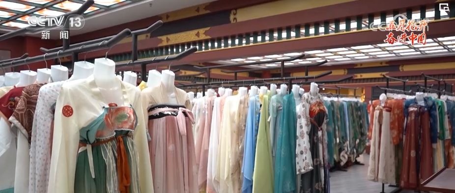 看起來對漢服造型頗有研究的胡芯銀今年只有24歲。胡芯銀介紹,也就是在這幾年,隨著大家對傳統(tǒng)文化的喜愛,西安的漢服館如雨后春筍般涌現(xiàn)。感受到“漢服熱”的胡芯銀在2022年初,辭去了原先婚禮跟妝的工作,應(yīng)聘到了這家位于長安十二時辰主題街區(qū)附近的漢服館,擔(dān)任漢服造型師。