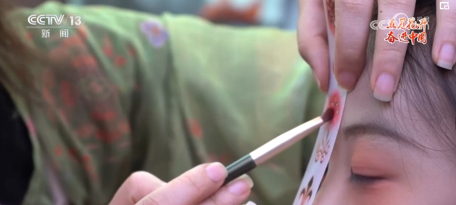 花鈿是古代女性在額頭部位點綴的一種花飾?,F(xiàn)在的胡芯銀,不僅會根據(jù)顧客的年齡、臉型和服裝的樣式來搭配不同風(fēng)格的花鈿,還會給小姐姐們做一些傳統(tǒng)文化的講解。胡芯銀說,要想做得更好,就要多看多學(xué)。