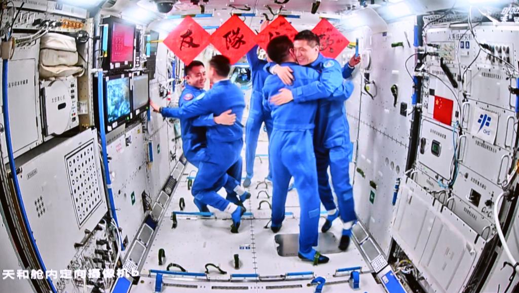 2024年4月26日5時(shí)04分,在軌執(zhí)行任務(wù)的神舟十七號(hào)航天員乘組順利打開“家門”,歡迎遠(yuǎn)道而來的神舟十八號(hào)航天員乘組入駐“天宮”。隨后,兩個(gè)航天員乘組拍下“全家福”,共同向牽掛他們的全國(guó)人民報(bào)平安。