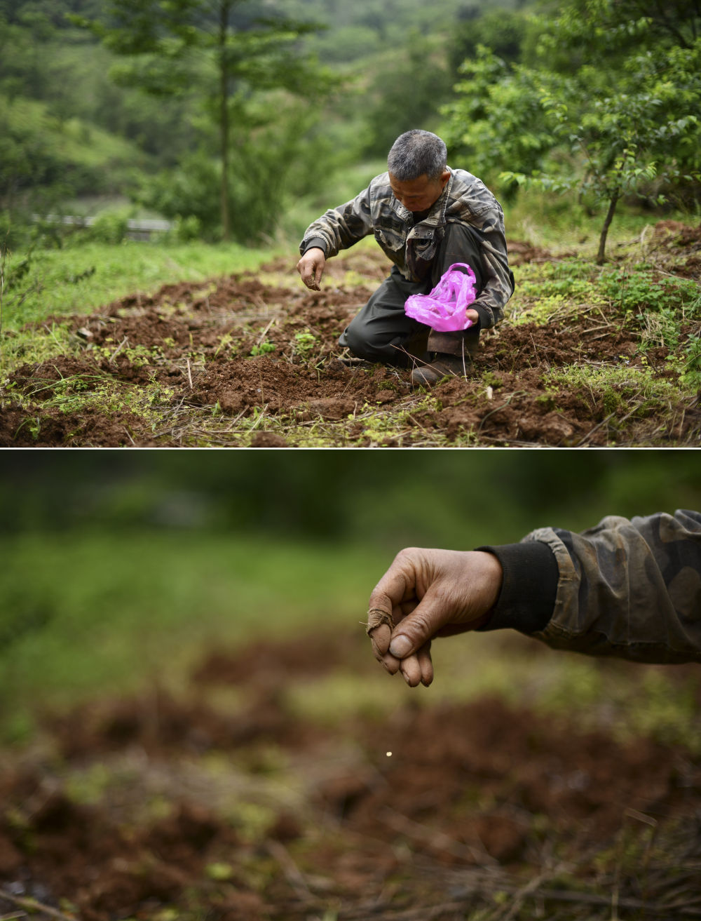 在廣西柳州市融安縣東起鄉(xiāng)銅板屯,村民龍革雄在山上播種(4月23日攝)。10多年來,龍革雄返鄉(xiāng)創(chuàng)業(yè),和村民們一起發(fā)展水果種植和觀光旅游。