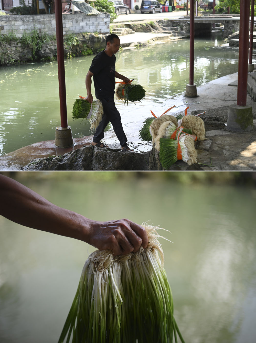 在廣西柳州市柳江區(qū)三都鎮(zhèn)覺山村,村民韋文中搬運(yùn)香蔥,準(zhǔn)備供應(yīng)市場(4月16日攝)。香蔥種植產(chǎn)業(yè)是覺山村村民增收致富的支柱產(chǎn)業(yè),韋文中種植10多畝香蔥。