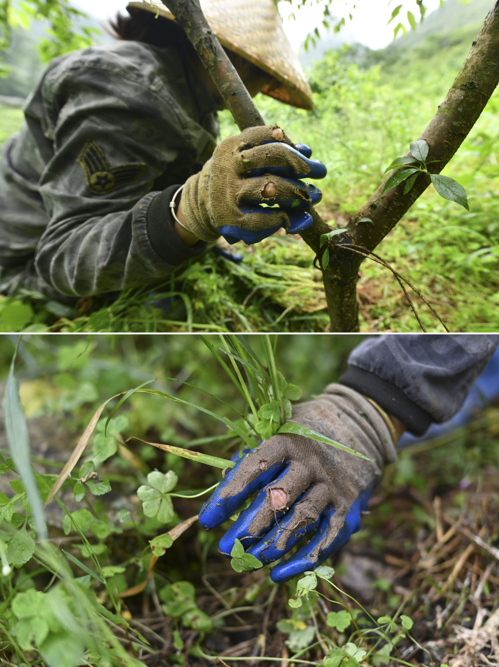 在廣西柳州市融安縣東起鄉(xiāng)銅板屯,村民羅桂枝在山上給果樹除草(4月23日攝)。10多年來,羅桂枝和丈夫返鄉(xiāng)創(chuàng)業(yè),和村民們一起發(fā)展水果種植和觀光旅游。
