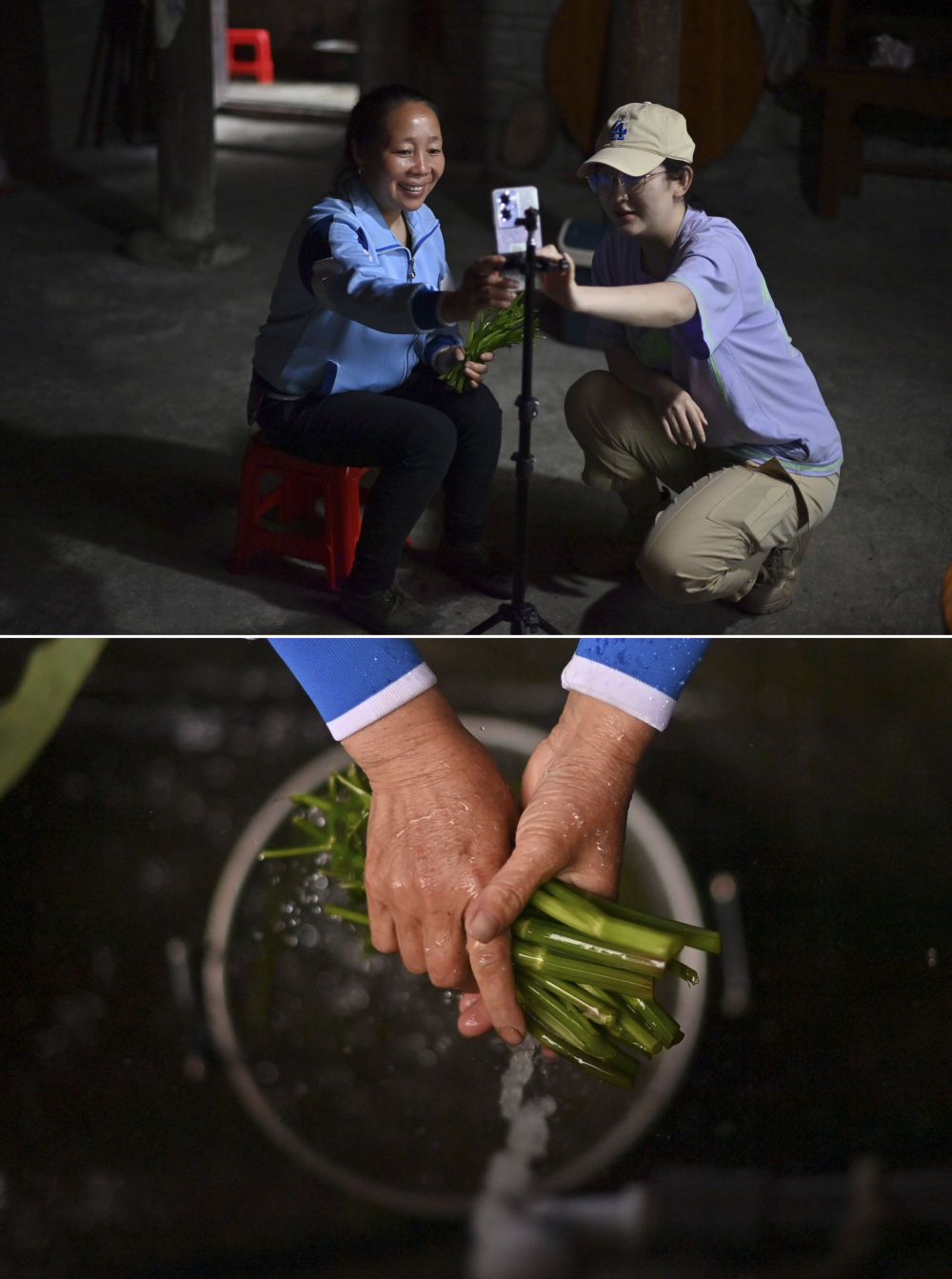 上圖:在廣西柳州市融水苗族自治縣桿洞鄉(xiāng)烏英苗寨,48歲的梁足英(左)向大學(xué)生學(xué)習(xí)直播帶貨;下圖:梁足英在洗野菜,準(zhǔn)備銷往縣城(4月30日攝)。近年來,她積極參加夜校學(xué)習(xí),并通過網(wǎng)絡(luò)直播銷售當(dāng)?shù)厥卟恕?/p>