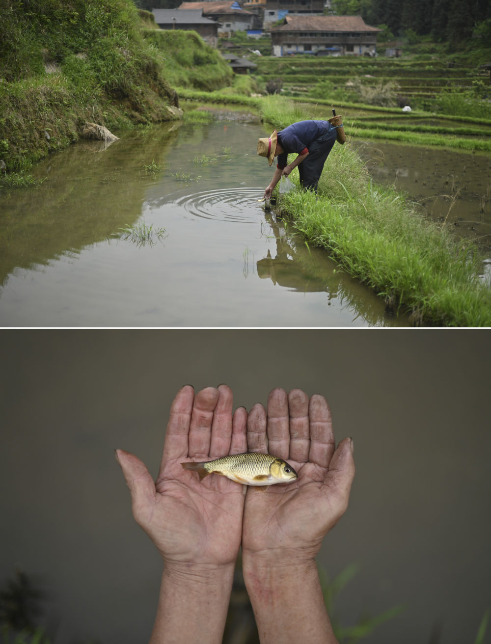 在廣西柳州市融水苗族自治縣桿洞鄉(xiāng)黨鳩村,67歲的吳慶輝在稻田里放魚苗(4月11日攝)。在稻田里養(yǎng)殖禾花魚是當(dāng)?shù)氐膫鹘y(tǒng),可以提高稻田利用率,增加收入。