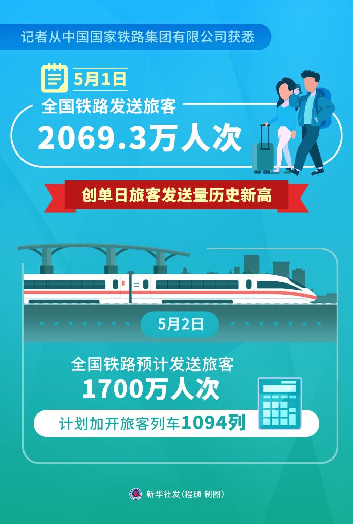 記者從中國(guó)國(guó)家鐵路集團(tuán)有限公司獲悉,5月1日,全國(guó)鐵路發(fā)送旅客2069.3萬(wàn)人次,創(chuàng)單日旅客發(fā)送量歷史新高。5月2日,全國(guó)鐵路預(yù)計(jì)發(fā)送旅客1700萬(wàn)人次,計(jì)劃加開(kāi)旅客列車(chē)1094列。