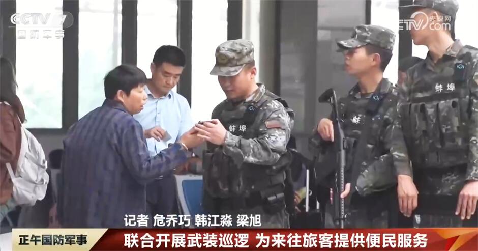 在安徽蚌埠火車站,武警官兵與公安特警聯(lián)合開展武裝巡邏,主動加大對重點(diǎn)區(qū)域的實(shí)時監(jiān)控和巡邏力度,在維護(hù)秩序的同時,官兵還耐心為廣大旅客答疑解惑,提供便民服務(wù)。