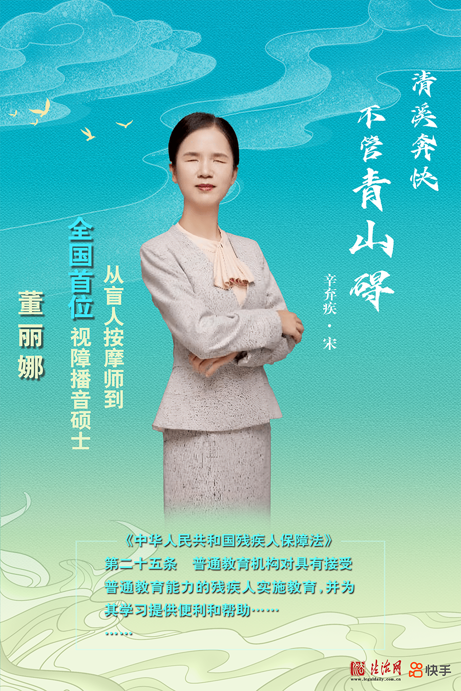 董麗娜先天弱視,10歲失明。但她自強(qiáng)不息、排除萬(wàn)難,在22歲時(shí)爭(zhēng)取到視障人士播音培訓(xùn)機(jī)會(huì),獲得一級(jí)甲等普通話證書,成為《麗娜品讀時(shí)間》的主持人。2020年考入中國(guó)傳媒大學(xué)攻讀碩士學(xué)位,2023年畢業(yè)成為全國(guó)首位視障播音碩士。