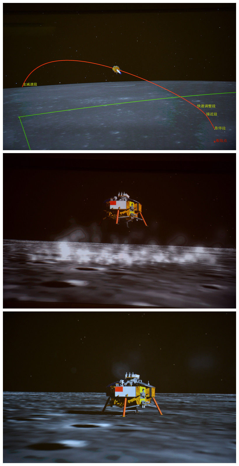 這是2019年1月3日在北京航天飛行控制中心拍攝的降落過程(示意圖)。2019年1月3日10時26分,嫦娥四號探測器自主著陸在月球背面南極-艾特肯盆地內(nèi)的馮·卡門撞擊坑內(nèi),實現(xiàn)人類探測器首次在月球背面軟著陸。新華社記者 金立旺 攝