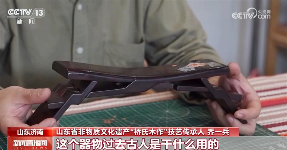山東省非物質(zhì)文化遺產(chǎn)“橋氏木作”技藝傳承人喬一兵介紹:“它本身是一整塊木頭六個(gè)面,通過(guò)鋸和鑿形成一個(gè)器物。這個(gè)器物過(guò)去古人是干什么用的?當(dāng)枕頭用的,也可以當(dāng)?shù)首佑茫畲蟮奶攸c(diǎn)是可以折疊,攜帶非常方便,傳說(shuō)是魯班發(fā)明的。和眾多的優(yōu)秀的傳統(tǒng)技藝一樣,它深層次代表的是中國(guó)的一些思想、一些哲學(xué)、一些文化在里邊,魯班枕的核心是平衡和和諧,我覺(jué)得我很有必要把它傳承下來(lái),發(fā)揚(yáng)光大。”