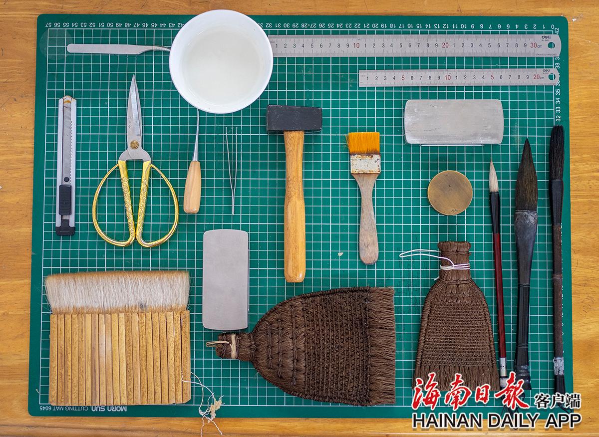 古籍修復(fù)師黃文鋒的部分工具。海南日?qǐng)?bào)記者袁琛 攝