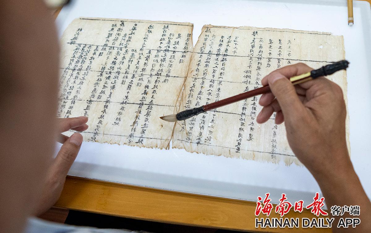 黃文鋒將修復(fù)后的古籍書(shū)頁(yè),粘貼、加固到新紙上。海南日?qǐng)?bào)記者袁琛 攝