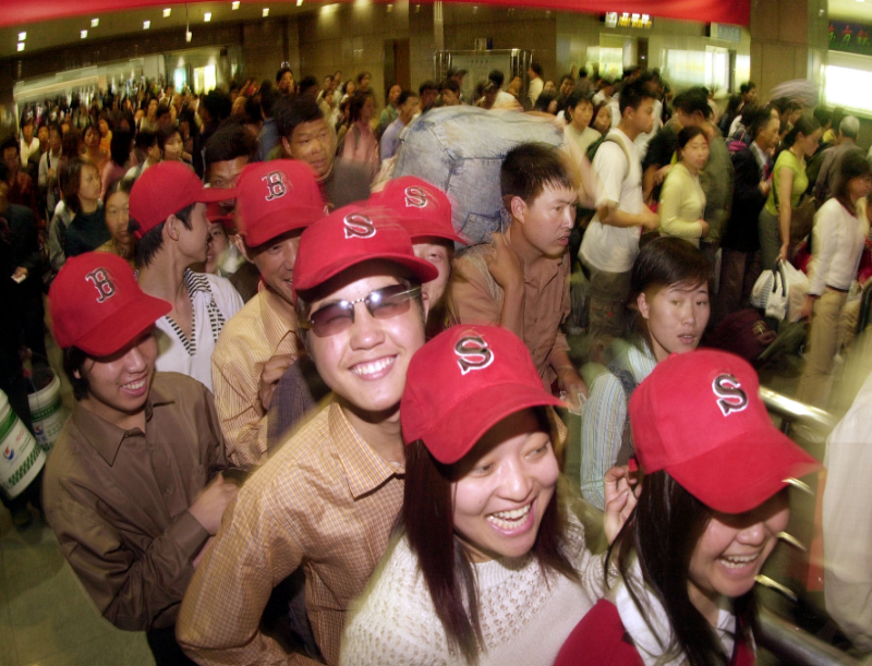 2004年5月1日,在杭州火車站出口處,大批旅行團(tuán)游客準(zhǔn)備出站。“五一”期間,來(lái)自全國(guó)各地的大批游人通過(guò)鐵路和公路涌入杭州,形成旅游高峰。新華社發(fā)(李震宇 攝)