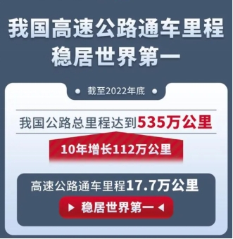1999年,“黃金周”這個(gè)概念第一次出現(xiàn)在大眾視野里,在那一年,全國(guó)高速公路通車?yán)锍虅偼黄?萬(wàn)公里。截至2022年底,我國(guó)公路總里程達(dá)到535萬(wàn)公里,其中高速公路通車?yán)锍?7.7萬(wàn)公里,穩(wěn)居世界第一。