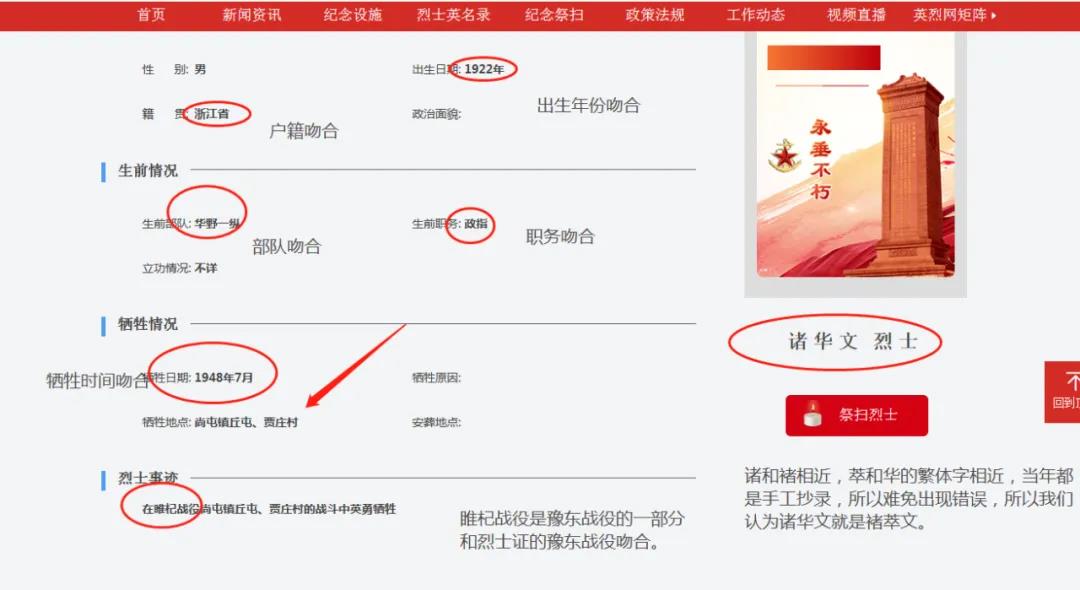 基本信息中,諸華文的出生年份、戶(hù)籍、生前情況和犧牲情況都與褚萃文吻合;姓名方面,“諸”與“褚”偏旁相似,而華的繁體寫(xiě)法(華)與萃也有些相似,可能是登記時(shí)出現(xiàn)了錯(cuò)誤。