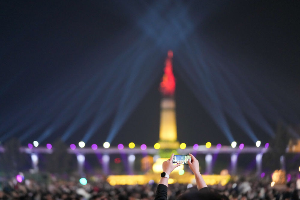 5月3日,人們?cè)诠枮I防洪紀(jì)念塔廣場觀賞光影秀。