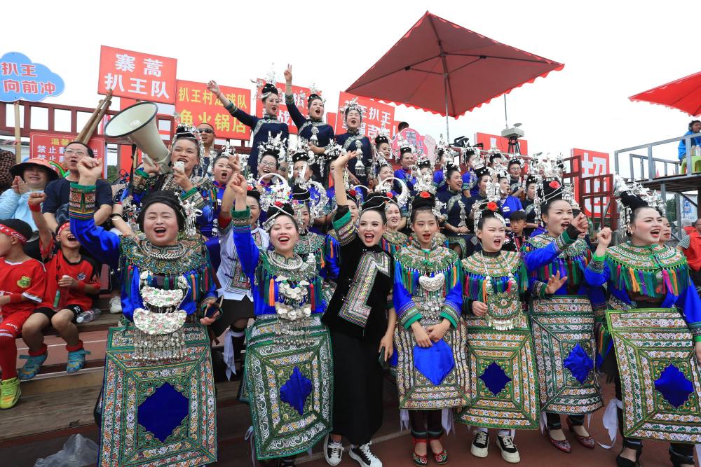 5月4日,在貴州省黔東南苗族侗族自治州榕江縣“村超”球場,身著盛裝的拉拉隊(duì)在為本村球隊(duì)加油鼓勁。新華社發(fā)(楊成利 攝)