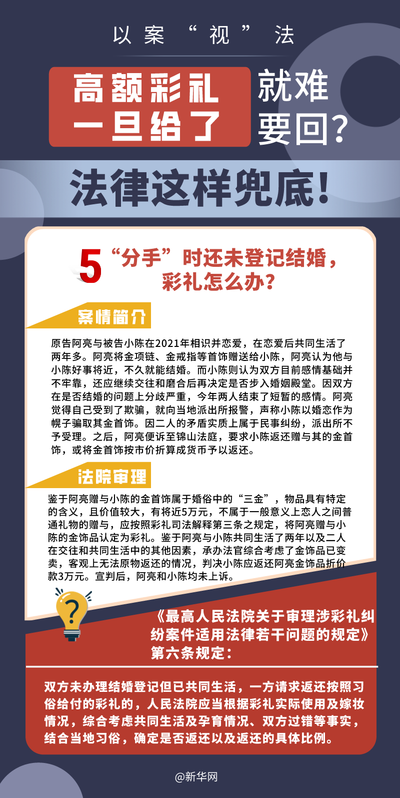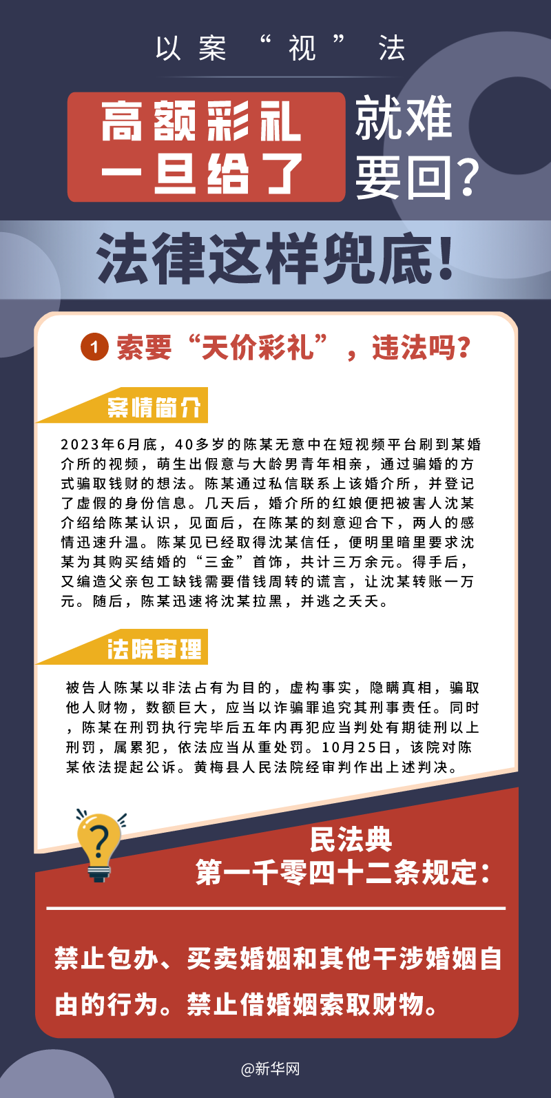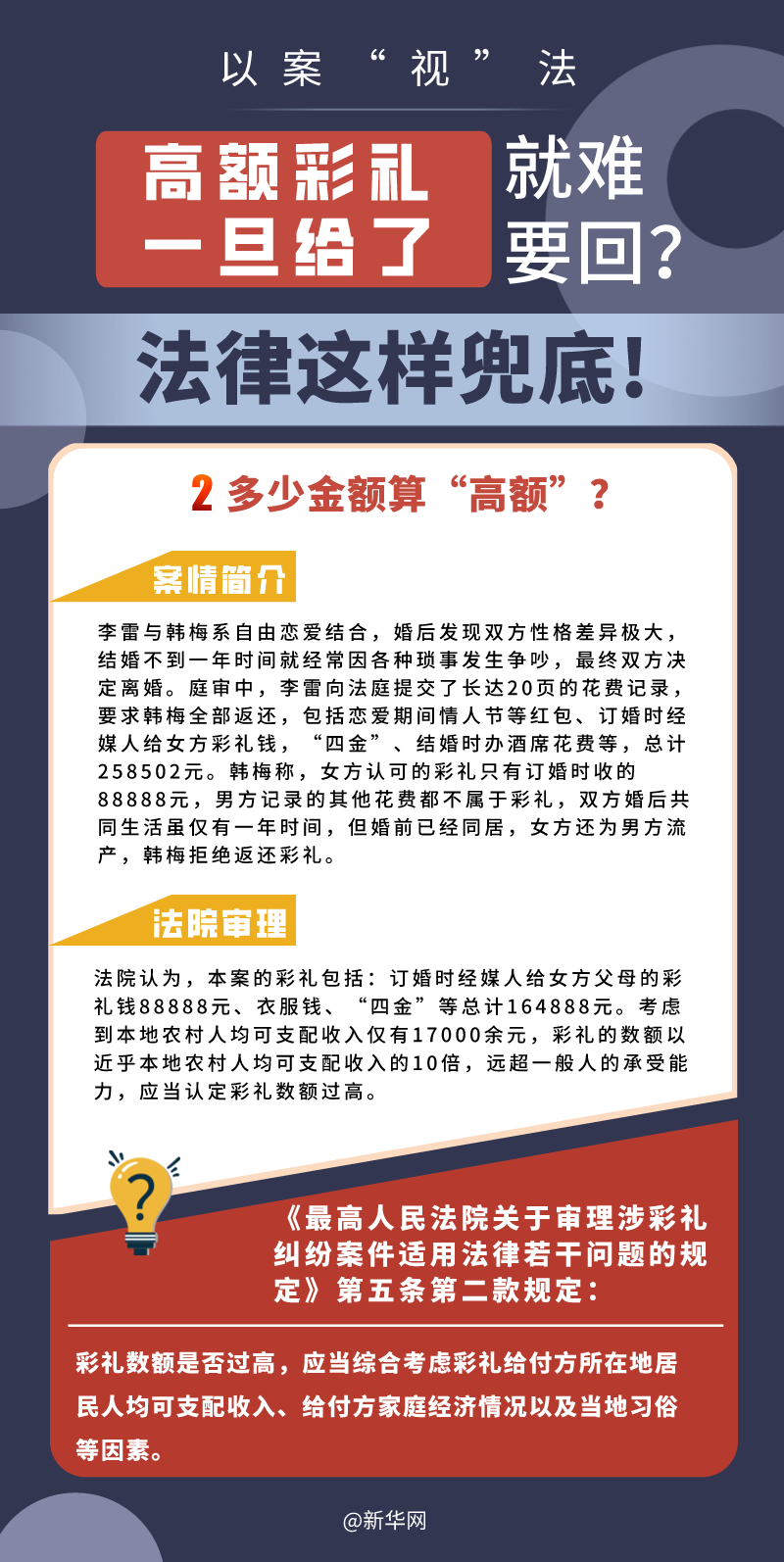 “五一”長假期間,各地迎來了婚禮高峰期,“彩禮”話題,尤其農村高額彩禮現象備受關注。破解高價彩禮,在解決爭議的層面,司法盡了最大努力兜底。本期《以案“視”法》針對涉“高額彩禮”糾紛,帶大家學習相關法律知識。