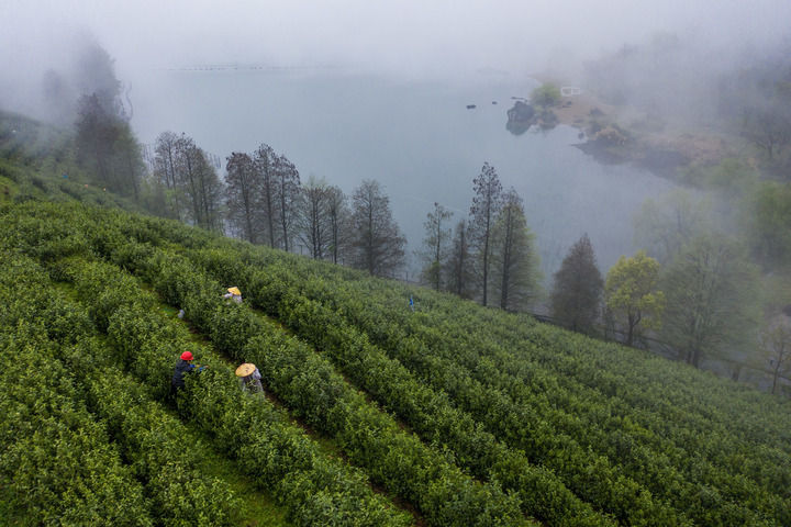 2024年4月7日,在位于浙江省金華市金華山鹿田村的婺州舉巖茶基地,茶農(nóng)在采摘舉巖茶鮮葉,發(fā)展特色茶產(chǎn)業(yè)是推動(dòng)當(dāng)?shù)匕傩展哺坏闹匾緩街唬o(wú)人機(jī)照片)。新華社記者 徐昱 攝