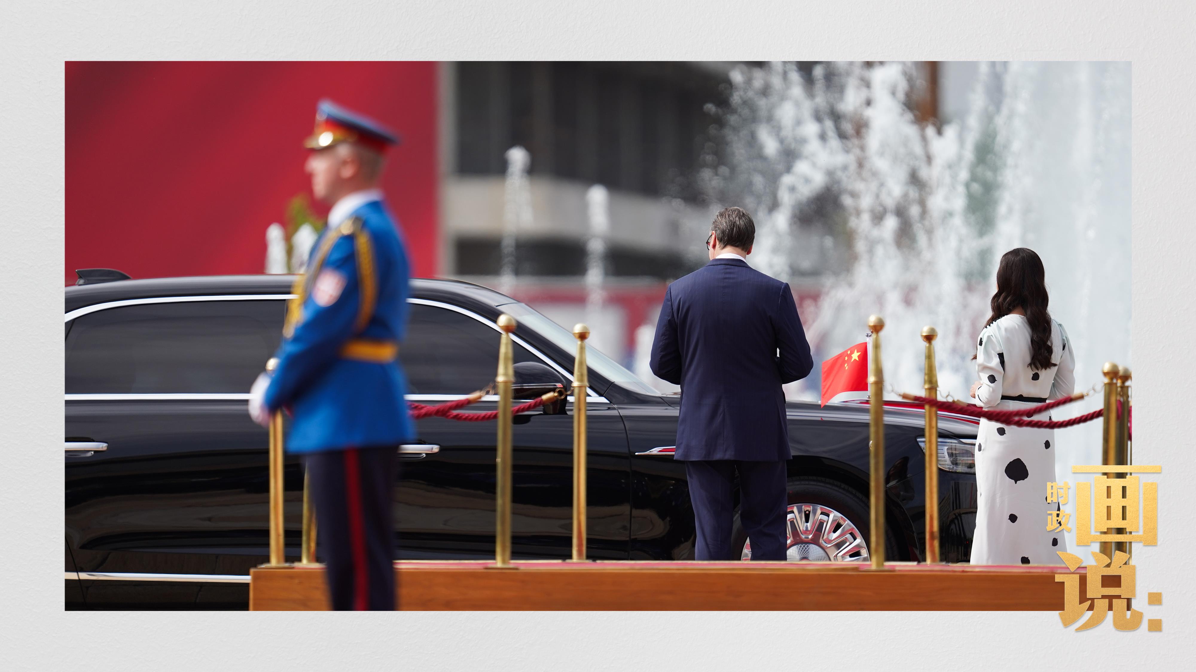 塞爾維亞大廈前廣場(chǎng),塞爾維亞總統(tǒng)武契奇和夫人塔瑪拉在下車處熱情迎接習(xí)近平和夫人彭麗媛。