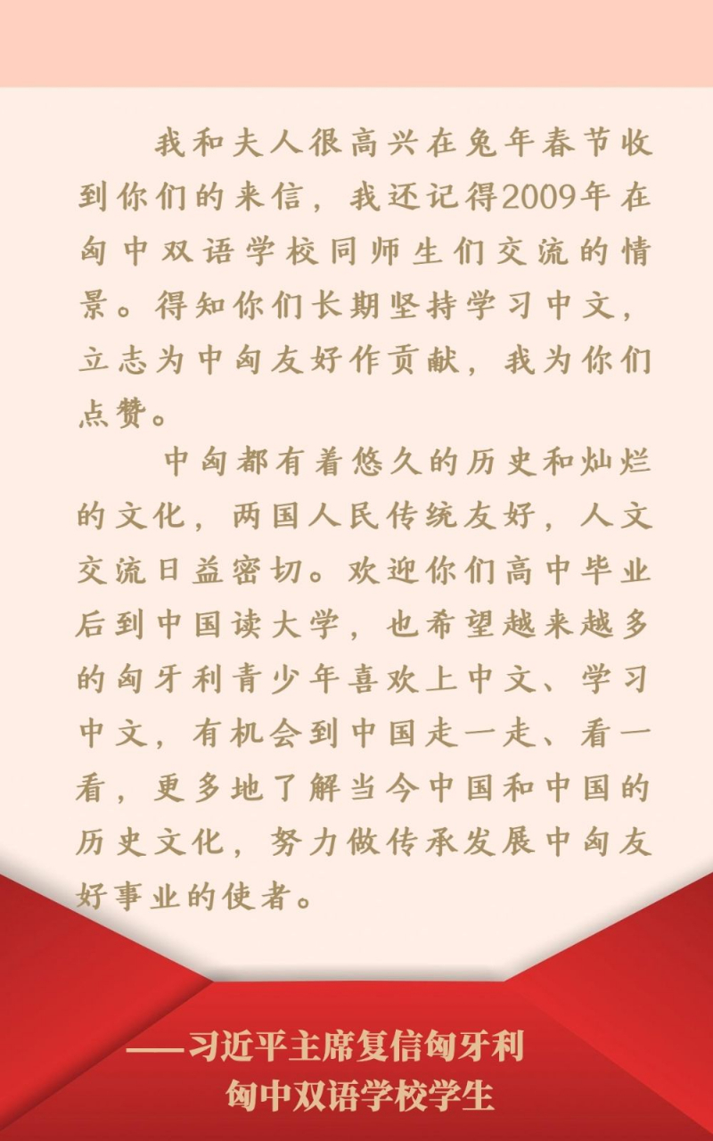 2023年春節(jié)前夕,匈中雙語學校學生胡靈月、宋智孝代表全校學生致信習近平主席和夫人彭麗媛教授,按照中國風俗拜年,講述在校學習中文12年的感受,表達將來到中國上大學、為匈中友好作貢獻的愿望。