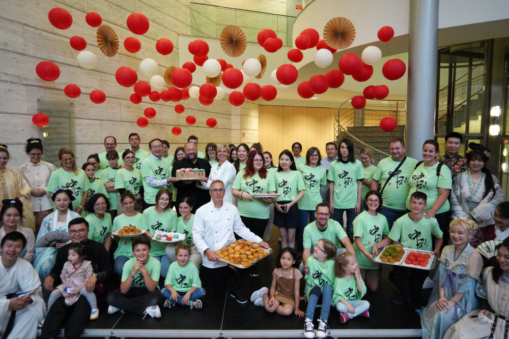 2023年9月3日,人們在匈牙利德布勒森市克爾切伊文化中心參加“第四屆匈牙利月餅制作坊”活動并合影。在此次活動上,500多名當?shù)厥忻颀R聚一堂,制作中秋月餅,體驗中國傳統(tǒng)文化。