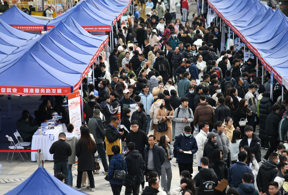 求職者在2024年陜西工會“春送崗位”就業(yè)服務(wù)月現(xiàn)場招聘會上了解招聘信息(2024年3月6日攝)。新華社記者 張博文 攝