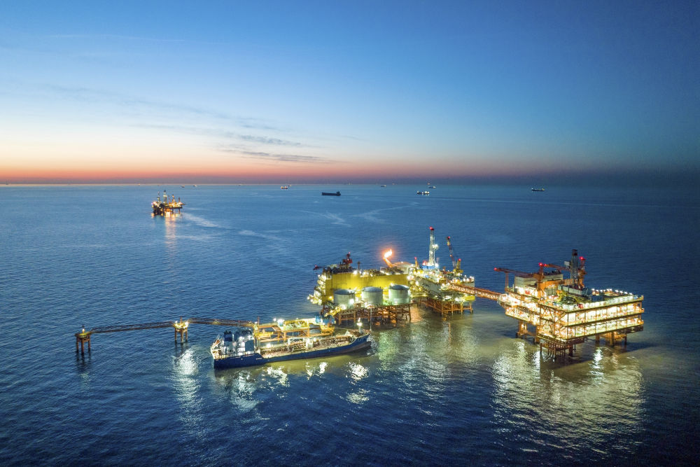 這是2024年1月25日拍攝的埕北油田全景(無人機照片)。當日,位于渤海灣西南部的埕北油田油氣處理與岸電設(shè)備共建平臺——CEPC(中心平臺)正式投產(chǎn),該平臺可使油田接入來自陸地的綠色電力,減少海上“自發(fā)電”帶來的天然氣和原油消耗。新華社發(fā)(杜鵬輝攝)
