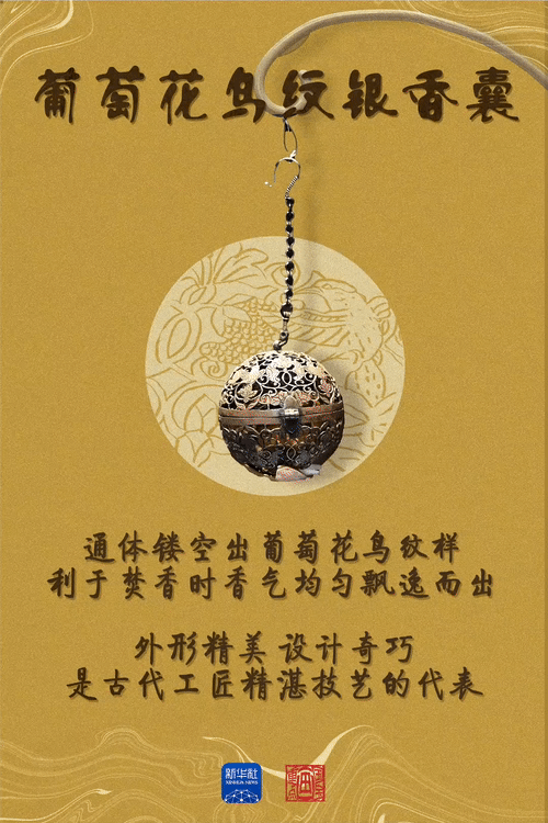 葡萄花鳥紋銀香囊體現(xiàn)了唐代貴族的生活意趣。“唐代社會的開放包容,人們生活中的儀式感都融入在這枚香囊之中?!标兾鳉v史博物館副研究館員賀達(dá)炘說。