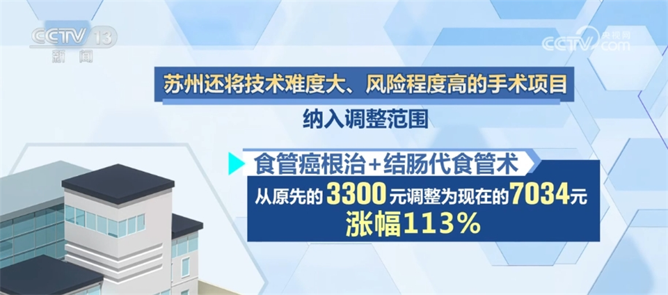除了推進醫(yī)療機構分級定價,蘇州市醫(yī)療服務價格改革對一些歷史價格長期偏低,不能體現(xiàn)技術勞務價值的項目進行調整。如骨髓活檢術的醫(yī)療服務價格由過去的65元調整為124元,漲幅91%;斷指再植術由過去的1800元調整為3275元,漲幅82%。此外,蘇州還將技術難度大、風險程度高的手術項目納入調整范圍,調整的手術項目占比約60%,并對四級手術優(yōu)先調整,共調整四級手術項目110項,占比約13%。如食管癌根治+結腸代食管術,從原先的3300元調整為現(xiàn)在的7034元,漲幅113%。調整后,醫(yī)保仍按甲類項目全額報銷,上漲費用全部由醫(yī)保基金支付,患者的個人負擔沒有增加多少。