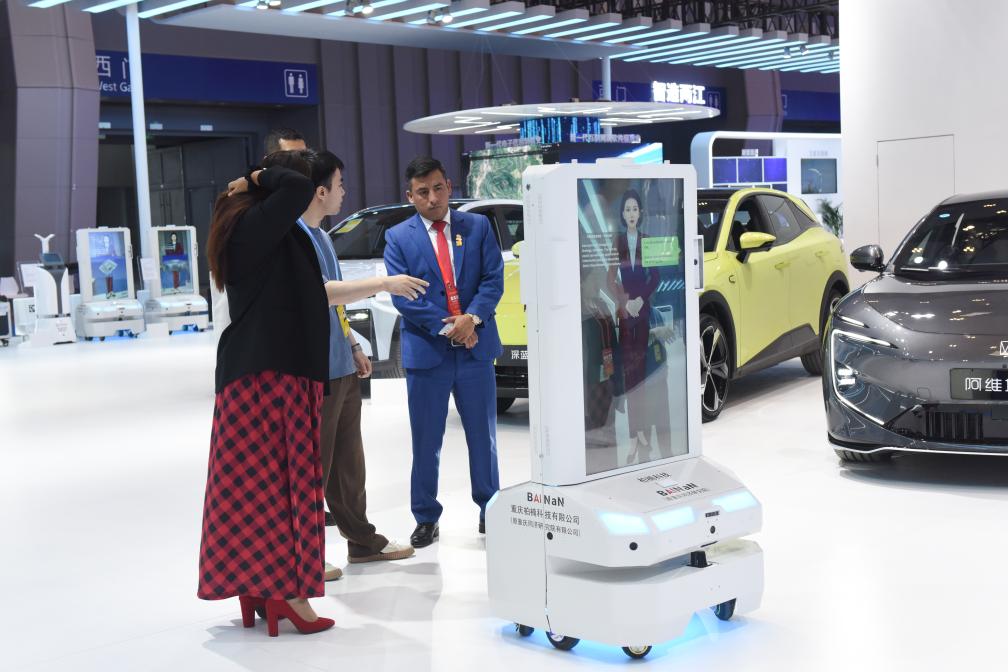 5月23日,工作人員在西洽會上給觀眾介紹講解機(jī)器人。新華社記者 張子彧 攝
