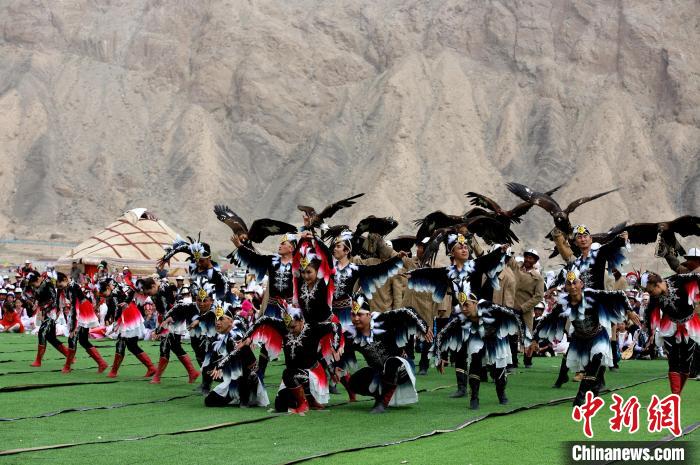 近日,2024年新疆阿合奇縣獵鷹文化旅游季拉開帷幕,活動現(xiàn)場獵鷹手與舞蹈演員共同演繹獵鷹舞。陶拴科 攝