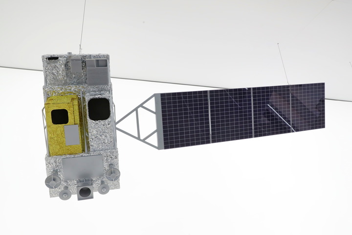 5月24日,在上海市閔行區(qū)的“大零號(hào)灣”創(chuàng)新策源館拍攝的風(fēng)云三號(hào)G星氣象衛(wèi)星模型。新華社記者 龔兵 攝