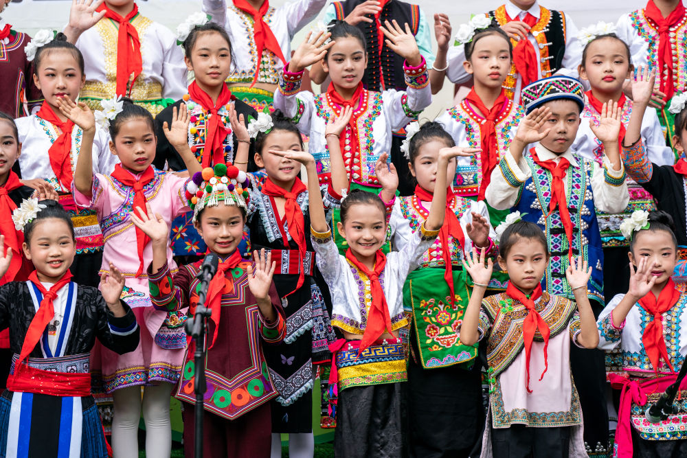 “咿唔瑟,咿唔瑟,吸噶拉羅,哈賽賽,賽哩羅作搓……”(歌詞大意為:巧遇大家來(lái)唱歌喲)視頻連線的另一邊,隨著哈尼族兒歌《阿密策》響起,38名身著苗、瑤、傣、哈尼族等民族服飾的同學(xué)們,將歡快的歌聲獻(xiàn)給“奧比昂爺爺”。