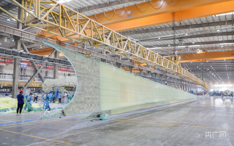 6條百米級(jí)及以上葉片生產(chǎn)線上,一個(gè)超百米長的“裸裝“風(fēng)力發(fā)電葉片放置車間中央,靜待技術(shù)人員“美顏”包裝。自主研制的陸上超大型玻纖葉片便是從這里運(yùn)往沙漠、戈壁、荒漠地區(qū)。