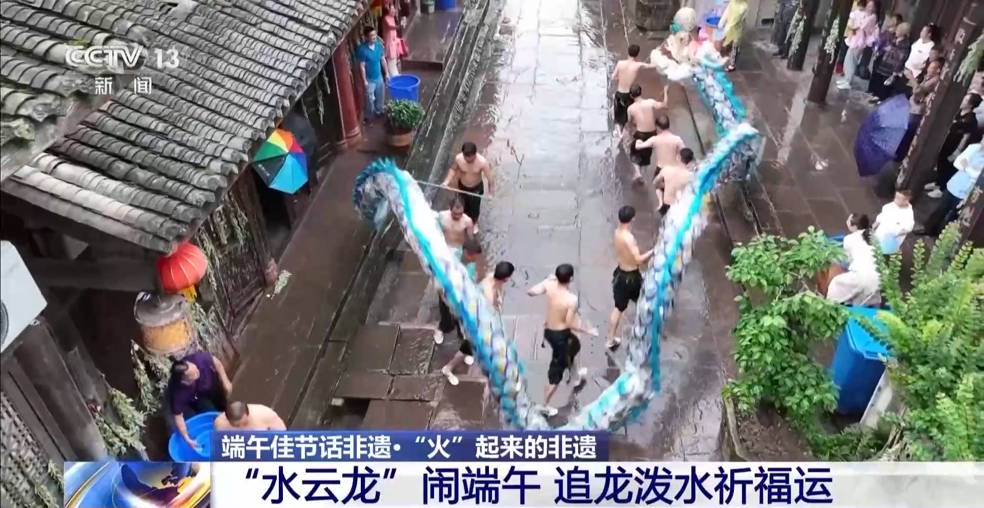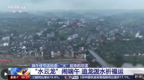 總臺記者 牟亮:我現(xiàn)在所在的位置就是重慶市銅梁區(qū)的安居古城,在我身后正在進行端午節(jié)的非遺文化表演,這是水云龍的表演。10名赤膊的漢子正在舞動一條18米的藍色水云龍,整條龍上下翻騰,左右騰挪,在兩邊明清時期的老屋之間穿行。而站在兩旁的居民和游客,會拿著水瓢或者水盆,將清水潑向正在舞動的水云龍。雖然水云龍所到之處,大家衣衫都可能打濕,但是大家都樂在其中。