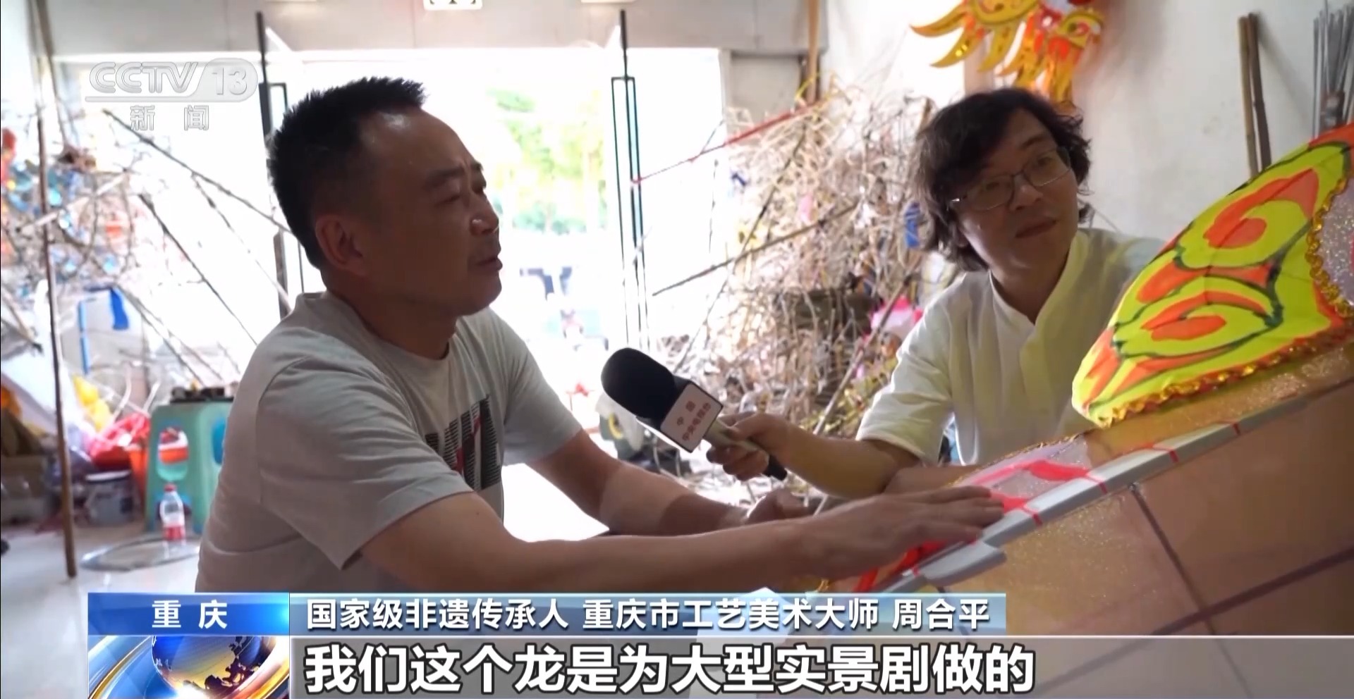 國家級非遺傳承人 重慶市工藝美術(shù)大師 周合平:我們這個龍是為大型實景劇做的,是一種夜光絨材質(zhì),是熒光色。