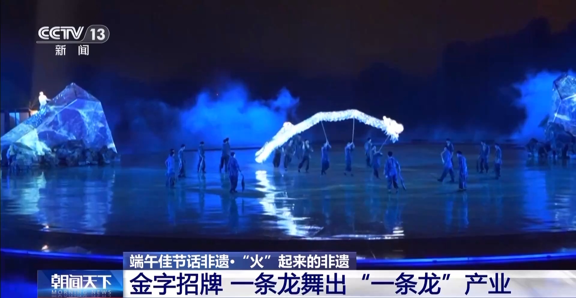 非遺的核心技藝在生產(chǎn)實踐中得到傳承。眼下,光是龍燈扎制業(yè)務(wù),已經(jīng)遍布全國十幾個省份,平均每年訂單超過1000萬元。如今,扎制好的龍燈,更多是被用在當?shù)氐凝埼璞硌萆?。這是大型非遺山水實景劇《追夢 銅梁龍》的演出現(xiàn)場,觀眾可以看到水云龍、荷花龍等十幾種銅梁傳統(tǒng)龍舞,其中壓軸戲,便是銅梁火龍。