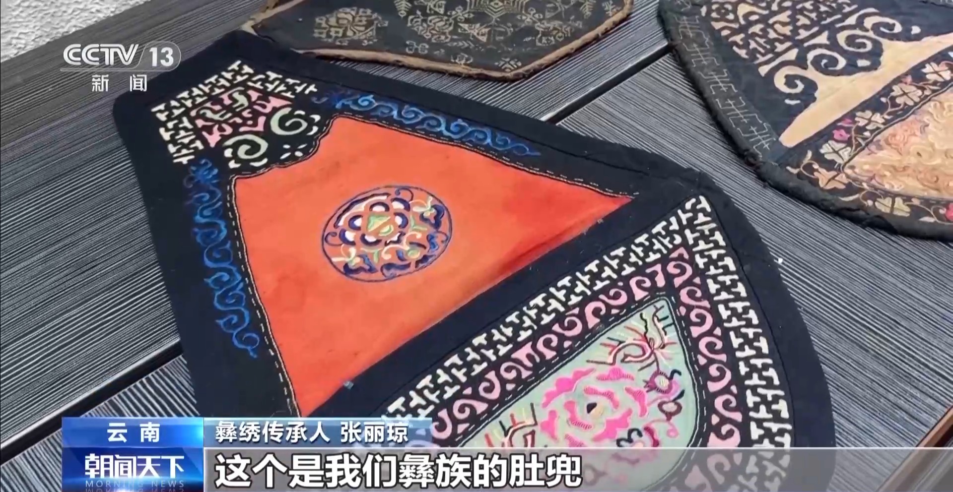 彝繡傳承人 張麗瓊:這個是我們彝族的肚兜,是彝族小姑娘送給彝族小伙子的定情物。它上面有很多現(xiàn)在已經(jīng)失傳的刺繡針法,像貼布繡、長針繡、平針繡。