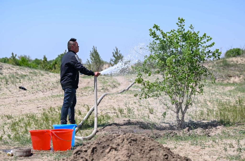 5月15日,在內蒙古通遼市科左后旗甘旗卡鎮(zhèn)巴克要系統(tǒng)化治理項目區(qū),工作人員在給一棵楓樹澆水。新華社 連振 攝