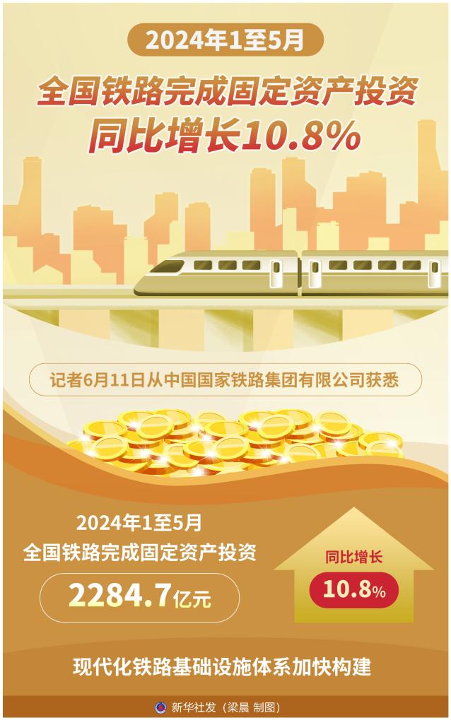 新華社北京6月11日電(記者樊曦、韓佳諾)記者11日從中國(guó)國(guó)家鐵路集團(tuán)有限公司獲悉,今年1至5月,全國(guó)鐵路完成固定資產(chǎn)投資2284.7億元,同比增長(zhǎng)10.8%,現(xiàn)代化鐵路基礎(chǔ)設(shè)施體系加快構(gòu)建。